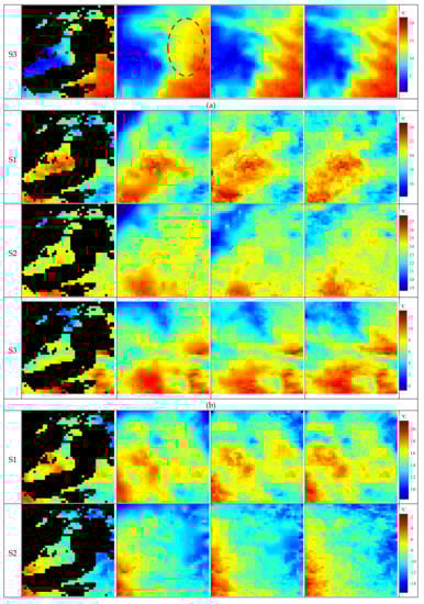 Examples of reconstruction results using MFCTR-CNN and the spline spatial interpolation method for FY-2G LST images during different seasons. (a) August 2015 (summer). (b) November 2015 (fall). (c) February 2016 (winter). (d) May 2016 (spring). S1, S2 and S3 represent periods of 06:00 to 12:00, 12:00 to 18:00, and 18:00 to 06:00 (local time), respectively.