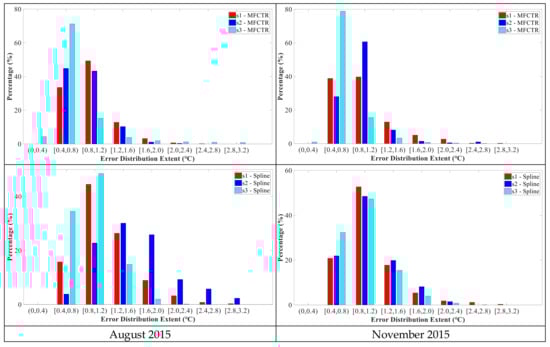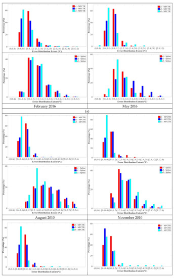 To better compare the error distribution of the two methods, we further carried out statistical analysis on the error of reconstructed LST images in the study areas. The resulting histograms are given in Figure 7. The errors for MFCTR-CNN were mostly concentrated in the 0.4 to 1.2 °C range for both FY-2G and MSG-SEVIRI. The errors for MFCTR-CNN in the night in the 0.4 to 0.8 °C range were mostly up to 60%. The distributions of errors for spline spatial interpolation were nearly normally distributed. The mean values of the normal distribution for FY-2G were approximately in the 0.8 to 1.2 °C range and about the 1.2 to 1.6 °C range for MSG-SEVIRI. For FY-2G, errors were distributed primarily under 3.2 °C, but the value is 3.6 °C for MSG-SEVIRI.