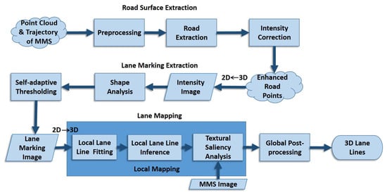 - Lane mapping: Lane markings in a local section are clustered and fitted into lane lines. LiDAR-guided textural saliency analysis is proposed to validate the intensity contrast around the lane lines in the MMS images. Global post-processing is finally adopted to complement the missing lane lines caused by local occlusion.