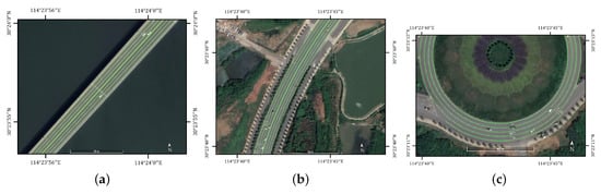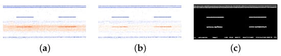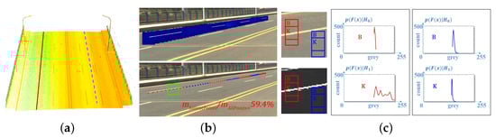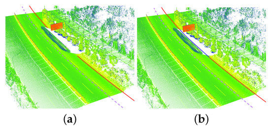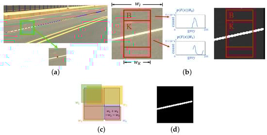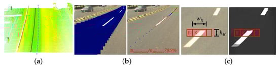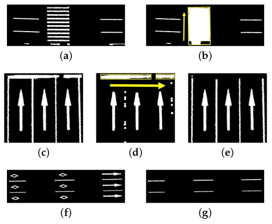 - A single marking of a zebra crossing is similar to a lane marking, but a whole zebra crossing can be distinguished by its crossing orientation, as shown in Figure 11a,b. First, a closing operation is performed over the binary image to obtain the mask image . Next, connected component labeling is performed on , and the connected components are denoted . Finally, the minimum area rectangle of each is calculated and the acute angle between the long axis and the trajectory line is obtained. with greater than will be regarded as a zebra crossing and removed, i.e., .