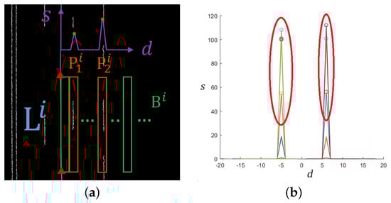 - If the lane-marking pixels fall into , s will be larger than the threshold and exhibit a peak. The peak buffer is denoted , where j is the number of peaks.