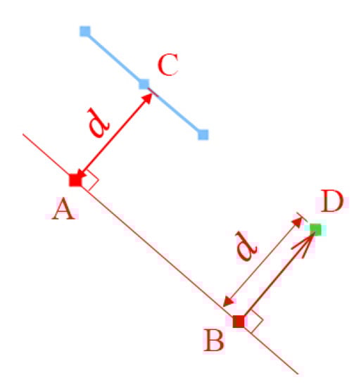 - As shown in Figure 12a, for each , a rectangular buffer is generated and moved along the orthogonal direction of with a certain step length. The step count and the number of pixels that fall within , which are denoted d and s, respectively, are recorded.
