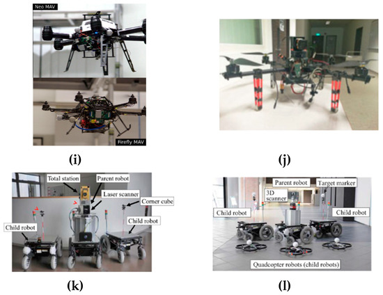Several examples of autonomous mobile scanning systems. (a) Ariadne robot, Surmann 2003 [5]; (b) ATRV-2 AVENUE robot, Blaer 2007 [7]; (c) Rosete platform, Strand 2008 [6]; (d) PR2, Blodow 2011 [8]; (e) Irma3D, Bormann 2014 [12]; (f) PR2, Potthast 2014 [9]; (g) MoPAD platform, Prieto 2017 [13]; (h) GRoMI, Kim 2018 [14]; (i) AscTec Firefly and AscTec Neo MAV, Bircher 2016 [15]; (j) UAV platform, Meng 2017 [16]; (k,l) CPS-VII and CPS-VIII, Kurazume 2017 [17].