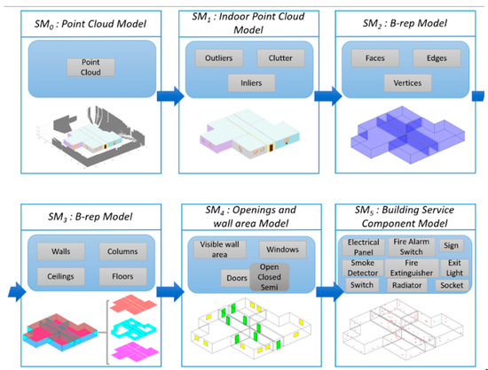 Some of the scanning systems referenced collect partial data of the environment [4] or do not generate a formal geometric model of the scene as seen in References [6,10,12,14,17]. However, our interest lies in generating automatically geometric semantic models of buildings. The degree of automation varies from the simple automatic acquisition of data (i.e., coordinates of 3D points, color, and temperature, etc.) carried out by mobile robots/platforms, to the automatic detection and positioning of small components of the building (e.g., signs or sockets on walls). In general, the modeling tasks are carried out at five levels, each of which provides a particular semantic model. Figure 2 shows these levels and the outputs at each of them.