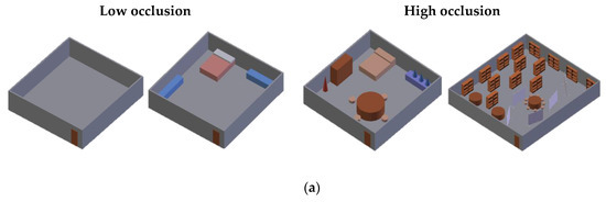 Figure 4a presents prototypes of low and high occlusion indoors, whereas Figure 4b shows different examples of scenes with occlusion that have been tested in autonomous systems.