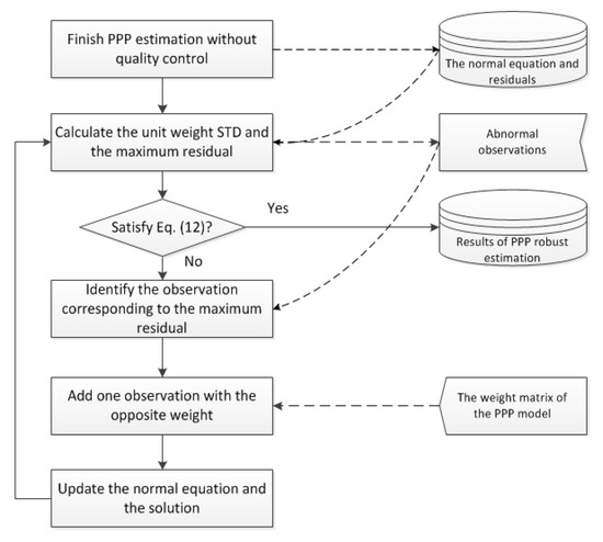 By combining Equation (7) and Equation (9), the robust model of real-time PPP estimation becomes the following formulas [34]:
