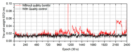 The positioning performance of the PPP estimation will be decreased by the unmodeled error due to the failure in detecting cycle slips. To analyze the influence of cycle slips on PPP estimation and validate the proposed quality control based on additional observations with opposite weight, the cycle detection algorithm uses the relatively loose threshold condition where the cycle slip will be defined if the epoch-difference geometry-free phase combination is more than three times larger than the difference between wavelengths on two frequencies, or the epoch-difference MW combination is larger than four cycles. By applying these experienced thresholds, the precision of PPP estimation is investigated in terms of the unit weight STD and the maximum weighted residual at each epoch. The weighted residuals are used to process the phase and pseudorange residuals uniformly. Figure 3 shows the unit weight STD with and without quality control, and Figure 4 shows the corresponding maximum weighted residuals.
