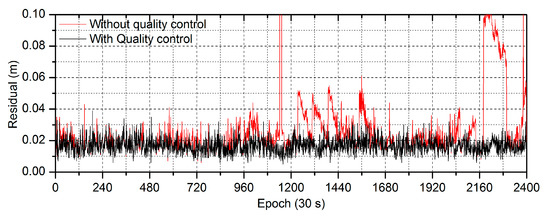 The real-time detection of cycle slips usually takes the TurboEdit algorithm, which uses the differences between epochs of both the geometry-free and Melbourne–Wübbena (MW) observations to identify cycle slips [35]. Because the differences are influenced by the observation interval and the elevation angle, the empirical thresholds are generally determined by some tests in advance [36]. Since it is difficult to detect all possible cycle slips and some outliers occur inevitably, especially for observations at low elevation angle, the PPP estimation would be abnormal without the robust control. As a result, the unit weight STD and the maximum residual are larger than the theoretical observation noise. Therefore, the unit weight STD can be used as the overall quality control and the maximum residual is imposed simultaneously to identify all possible outliers. The criteria of the quality control can be expressed as