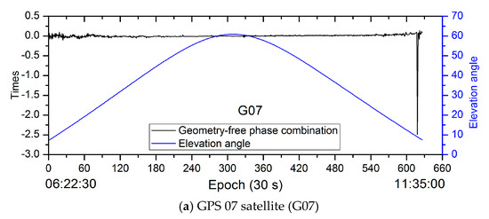 It can be seen from Figure 3 and Figure 4 that there are several large anomalies on the unit weight STD curve and the maximum weighted residual curve of the single GPS PPP solution without quality control. For example, the maximum weighted residual occurs on the G07 phase data between the epochs 1142 and 1151 (11:31:00 and 11:35:00, coordinated universal time (UTC)) and reaches about 0.26 m, which is 0.84 m in terms of the original residual. The corresponding unit weight STD is about 0.18 m at this epoch. Similarly, the phase weighted residuals of the G05 satellite are also abnormal, with the variation from 0.11 m to 0.07 m at epochs 2180 to 2297 (20:09:30 to 21:08:00, UTC time) and the unit weight STD is from 0.06 m to 0.04 m. The corresponding original residual is from 0.32 m to 0.28 m. At the last few epochs after 21:46:00, the weighted residual of the G29 satellite is also abnormal. There are also some other small anomalies for the solution without quality control. The anomalies might be caused by the ignorance of cycle slips, where one is about 0.24 m and 0.19 m for L1 and L2, respectively. The magnitude is enlarged by the ionospheric-free combination and other observations’ residuals might be influenced through their common parameters. In order to analyze these anomalies, the times of the difference between wavelengths on two frequencies for the epoch-difference geometry-free observations and the elevation angle are presented in Figure 5.