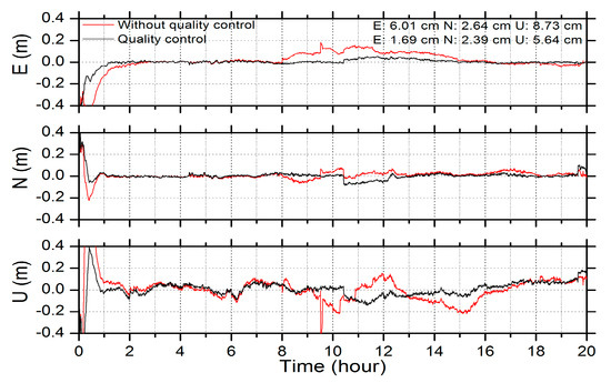 Figure 5 shows that the epoch difference of the geometry-free phase combination is abnormal at epochs around 11:31:00, 20:09:30, and 21:50:30 for G07, G05, and G29 satellites, respectively. It indicates that cycle slips are easy to occur at the period when the elevation angle is low and they are difficult to be detected by the data preprocessing procedure. The larger residual and worse PPP estimation performance will be caused by these unmodeled cycle slips. The geometry-free phase variation of the G07 satellite is largest and reflects the largest cycle slip, which results in the greatest impact on the positioning error curve. Figure 6 shows the positioning error of the single GPS PPP solution with quality control and without quality control.
