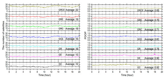 Figure 8 describes the number of available satellites for each scheme and the corresponding position dilution of precision (PDOP). It can be seen that the number of available satellites is generally more than 20 for the quad-system combination and almost 30 at some epochs. The quad-system PDOP is the best and the average is 0.65. For the GRC and GRE combination, the PDOP value is about 0.70, which is slightly larger than the quad-system constellation since the latter has more visible satellites. Therefore, the quality control can remove all possible outliers one by one, benefiting from the best geometry. Table 3 shows that with the quality control, the GR, GRC, and GRE combinations achieve an accuracy of about 1 cm in the east and north components, while it is about 4 cm in the upward component, which is only about 2 mm worse than the GRCE combined PPP. Their convergence time is less than 10 min in horizontal and vertical components. The number of visible satellites for the GCE combination is almost equal to that of the GR combination. The average satellite numbers are 15 and 16, respectively, while the corresponding PDOP values are 0.81 and 0.76. Therefore, the GR combination can achieve comparable positioning performance with the triple-system combinations. However, the number of visible satellites is only about 12 and the PDOP value is about 0.90 for both GC and GE combination, which leads to relatively worse positioning accuracy and much longer convergence time.
