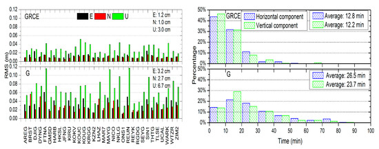 Figure 10 shows the results of the GRC, GRE, and GCE PPP. The positioning RMS values of the GRC and GRE PPP are comparable to the GRCE combined PPP and they are better than the accuracy of the GCE combined PPP. The further integration with another system for the triple-system combination, however, does not make large improvement in the positioning accuracy and the convergence time. Compared to the GRC combined PPP, the GRE combined PPP achieves slightly better positioning accuracy. For the horizontal and vertical components, 71.0% and 77.2% of stations for the GRE combination converge in 20 min, respectively, while 69.7% and 76.3% are obtained for the GRC combination. The average convergence time is about 13 min for both the GRE and GRC PPP. The GCE combined PPP takes a much longer time to converge than the GRE and GRC PPP and the average time is about 17 min.