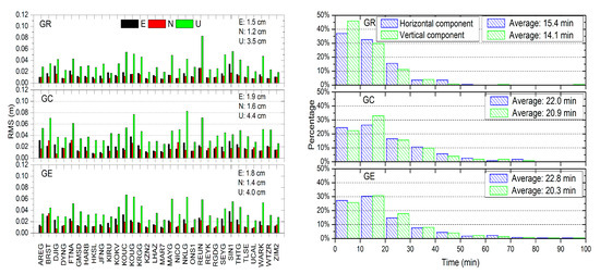 The positioning RMS and the distribution of the convergence time of the GR, GC, and GE PPP are shown in Figure 11. It can also be seen that the combination of two systems not only improves the positioning accuracy, but also shortens the convergence time compared to the single GPS PPP. The improvement of the positioning RMS in the east component for the GR, GE, and GC combination is 53.1%, 43.8%, and 40.6%, respectively, while for the north component, it is 55.6%, 48.1%, and 40.7%. It is 47.8%, 40.3%, and 34.3% in the vertical component. The GE and GC PPP accuracy is slightly poorer than the GR PPP because the number of satellites is lower. The best dual-system combination is the GR combination, where the positioning performance is close to that of the triple-system combination. The convergence time of the GE and GC combination is about 22 min, while it is about 15 min for the GR combination. For all cases, the north component shows higher positioning accuracy than the east component, which is related to the satellite constellation configuration.