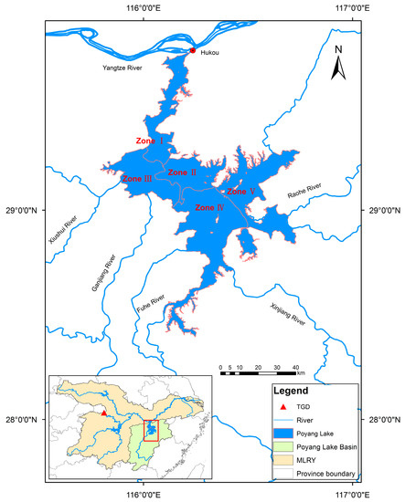 The location and hydrographical zones of Poyang Lake in China.
