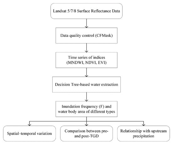Workflow of this study. MNDWI: modified normalized difference water index; NDVI: normalized difference vegetation index; EVI: enhanced vegetation index; and TGD: Three Gorges Dam.