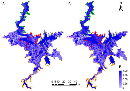 Inundation frequency (F) distribution of (a) 2016 and (b) 1988–2016 (the zone numbers and their respective boundaries are presented with five different colors).