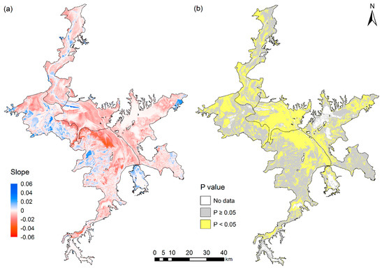 The variation tendency mapping of Fy of Poyang Lake during 1988–2016 ((a) slope, (b) p-value).