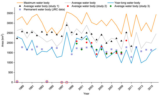 To quantitatively compare our results of surface water body area with related studies (i.e., study 1 [20], study 2 [24], and study 3 [19]), which includes annual average water body area of Poyang Lake, we defined and calculated the area of average water body of the lake in each year during 1988–2016 with Equation (1):