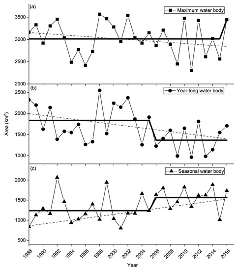The inter-annual dynamics of the (a) maximum, (b) year-long, and (c) seasonal water body areas during 1988–2016, with the Theil–Sen (TS) trends fitted in dashed lines and the average annual area regime shifts denoted in bold lines.