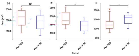 Box–whisker plots of the (a) maximum, (b) year-long, and (c) seasonal water body areas with t-test significance level (“*”: p < 0.05; “**”: p < 0.01; “NS”: non-significant) between the pre- and post-TGD periods.