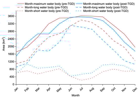 The seasonal behavior of the water body area in the two periods was also graphed. In Figure 10, the three types of monthly water body areas show different variation patterns. As mentioned in Section 2.3.1, the month-long water is the surface water appears most (i.e., more than three quarters) of the time in a month, while the occurrence time of month-short water is less than the month-long water within a month. The month-maximum water body area is the sum of the month-long water body area and month-short water body area, which indicates the maximum area of surface water body in a month. The month-maximum water body area of Poyang Lake had an “up-steady-down” pattern of variation: the area grew steadily beginning in January (except for a small drop in April in the post-TGD period), kept a stable and high level in the summer, and began to decrease in autumn. The month-long water body area presented a similar pattern but had a shorter steady stage. The month-short water body area had more wave crests and did not show a typical pattern of inner-annual fluctuation. Comparing the water body area between the two periods in Poyang Lake, we could find that in most months, the month-maximum and month-long water body areas in the pre-TGD period were larger than those in the post-TGD period, and the month-short water body area showed the opposite trend.