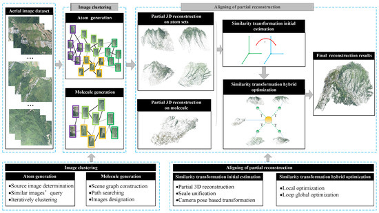 Framework of the proposed method, which contains two main parts: image clustering and the aligning of partial reconstructions. In the first part, we perform image clustering to get two image subsets, named atoms and molecules. Specifically, the images with the same color bounding box belong to the same atom. On the basis of image clustering, we utilize the image repetition relation between atoms and the corresponding molecule to align multiple partial reconstructions. In the aligning process, the similarity transformation is initially estimated by using the joint camera poses of common images and then optimized by our hybrid optimization method to realize a seamless fusion.