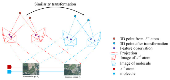 In this paper, we propose a concise method to perform a similarity transformation without 3D point matches, as illustrated in Figure 3. Taking a group of atoms and the corresponding molecule as an example, here, we suppose there are L atoms in total. The atom shares some common images with the molecule, which are denoted as . Firstly, the scale between the partial reconstructions on an atom and molecule pair should be unified. For each image, we can get its camera center in the frame of the atom or molecule. Since the camera model that we used is the basic pinhole model, according to the principle of multiple view geometry [28], supposing an image is , its camera center is defined as: