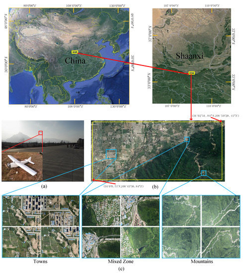 (a) UAV platform flying over the Qinling mountains; (b) example of image acquisition area visualized by Google Earth, in which the area surrounded by the yellow bounding box denotes an area of 57 square kilometers. (c) Typical aerial images.