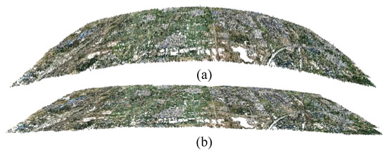 However, using global SfM for large-scale scene reconstruction will not only encounter the problem of low efficiency, but also lead to the decline of reconstruction accuracy due to the increase in the number of images. As can be seen from Figure 10a, the model reconstructed by global SfM has an overall curved trend. The cause of this phenomenon is as follows. In essence, global SfM through motion averaging deals with error accumulation effectively. However, with an increase in the number of images, bad feature matching also increases, leading to the increase of errors. In this case, through the motion average, the accuracy of reconstruction decreases, so the reconstructed model shows an overall tendency to bend. However, the scene structure reconstructed by our method also shows a slight bending (as shown in Figure 10b), but this is far less than the bending degree of global SfM. The reason is that the reconstruction result of our method is the fusion of multiple partial scene structures, and due to the small number of images in each group, the bending degree of the model obtained from partial reconstruction is relatively small, so the overall bending degree of the fused model is not as large as that directly reconstructed by the global SfM. Therefore, the accuracy of our method will be better than the global SfM.