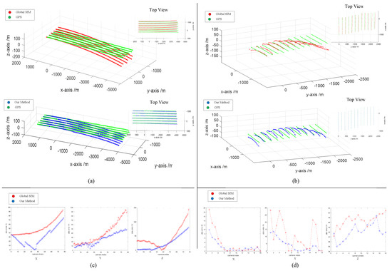 To analyze quantitatively the difference in accuracy between our method and the global SfM, we conducted an experimental comparison of the accuracy of the reconstructed camera trajectory. Here, we used the GPS as the ground truth of the camera trajectory. In order to compare the two methods under the same coordinate system, we used the similarity transformation to register the ground truth and the computed coordinate system. Before the registration, a reference point needed to be determined to translate the GPS value into geodetic coordinates. The comparison results are shown in Figure 11a,b. In order to quantitatively show the difference between the reconstructed trajectory and GPS, we computed the absolute difference in the X, Y, and Z axes, respectively. Since the trajectories of the two datasets are both in the shape of periodic bands, for clarity, the shapes of the trajectories can be described as a matrix. Along the UAV moving direction, it is called a row; perpendicular to the UAV moving direction, it is called a column. When calculating the absolute difference between the reconstructed trajectory and the GPS, we summed and averaged the data in the same column. The absolute differences are shown in Figure 11c,d. As we can see, compared to the global SfM, the camera trajectory reconstructed by our method is closer to the ground truth.