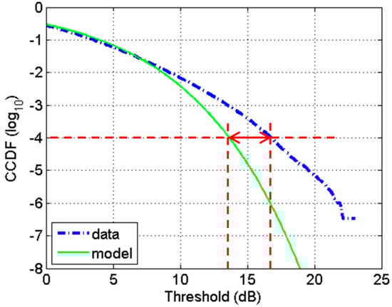 Measurement of the threshold error at 10−4 between the actual CCDF (blue thick dotted line) and the model CCDF (green line).