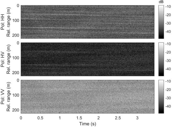 The data assessed here is summarized in Table 1 and was generated during a 2010 series of trials in South Africa near the Cape Point area. The baselines between each of two radar nodes and the illuminated area were 1830 m and in order to vary the bistatic angle, the antennas were rotated to cover different regions of the sea. The grazing angles from the geometries varied from 0.6° to 1.5° [23], which will have a minor impact on the backscattered signal compared to changes with the polarization or the bistatic angle. In the following analysis, 10 s of data have been used for each run, resulting in more than 106 samples. Wind and wave information is given in Table 1 and was obtained from the Cape Point wave buoy, approximately 7 km from the trial location. In Figure 4, an example of the monostatic and bistatic radar data is displayed for a bistatic angle of 60°.