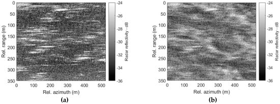 SETHI is the airborne remote sensing radar developed by ONERA [6]. It is a pod-based multi-frequency high resolution SAR system designed to explore the scientific applications of remote sensing. Both L- and X-band SAR data have been collected at two different geographical positions, the Atlantic ocean and the Mediteranean sea along the French coast. The bandwidths are 300 MHz at X-band (9.6–9.9 GHz) and 150 MHz at L-band (1.25–1.4 GHz). The data presented in this paper is described in Table 3 and covers grazing angles from 10° to 45°, different sea states (significant wave heights from 1.1 to 4.9 m), a range of azimuth angles and either dual-polarized (HH, VV) or quad-polarized (HH, HV, VH, VV) antenna combinations. The flying trajectory was either linear (stripmap mode) or circular (spotlight mode) and the wind and wave information given in Table 3 was obtained from Météo-France, the French national meteorological service. An illustration of the X-band dual-pol SAR data at 10° grazing is given in Figure 6 (Run 3) where the horizontal and vertical axes correspond to the along-track (azimuth) and across-track (range) directions. Strong differences in radar responses can be seen as a function of the polarization state: the HH backscattered signal (Figure 6a) is strongly affected by sea-spikes (e.g., breaking waves), while the VV signal (Figure 6b) is dominated by short scale waves [25].