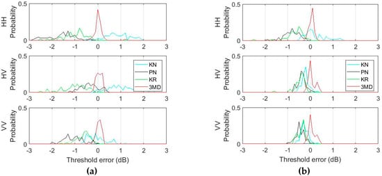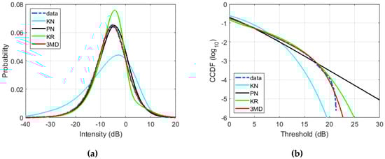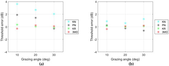 Results of the threshold error for a CCDF of 10−4 are then displayed in Figure 11, where low errors are observed for both the KR and 3MD models (<±1 dB), while the PN and KN distributions have a greater mismatch with errors up to ±4 dB. If the PN distribution was used in a detection scheme with such a large mismatch, there will be a large number of missed detections. Conversely, if the KN distribution were used, there would be a higher probability of false alarm.
