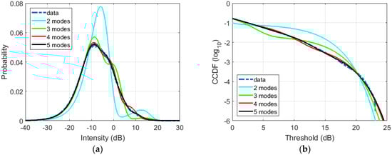 Model fits for the 3MD distribution with different numbers of modes using the NetRAD data S-band, VV-polarization, bistatic configuration, 60° bistatic angle (Run 1). Illustrations show the (a) PDF, (b) CCDF.