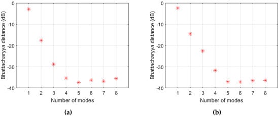 Bhattacharyya distance (dB scale) for the 3MD distribution using different numbers of modes with the NetRAD data, S-band, bistatic configuration, 60° bistatic angle. (a) HH polarization (Run 4), (b) VV polarization (Run 1).