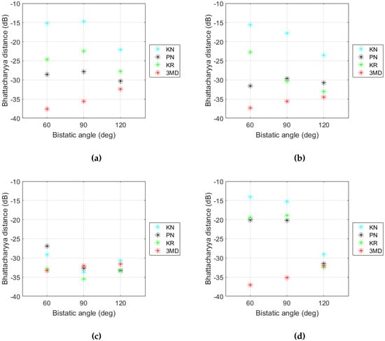 NetRAD S-band: Bhattacharyya distance (in dBs) for the NetRAD data. (a) HH polarization, monostatic, (b) HH polarization, bistatic, (c) VV polarization, monostatic, (d) VV polarization, bistatic.