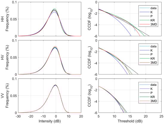 In this section we study the accuracy of the four models described in Section 3 when fitting amplitude distributions to the NetRAD dataset. Figure 10 first shows the BD for each bistatic angle and polarization. The only result that shows a good match for nearly every model (BD ≤ −30 dB) is the monostatic case with VV polarization (Figure 10c). However, it is only the 3MD distribution that has a consistently low BD over all the datasets. The other results are mixed with the PN and KR models both providing a good fit with some datasets, while mismatching with others (BD > −30 dB). The KN model nearly always fails to accurately fit the data.