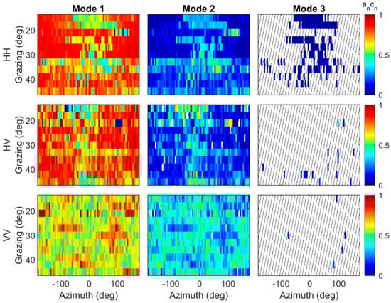 In order to further study the modes of the 3MD model, we compare the product of the texture locations and the proportion [17]. For INGARA Runs 3 and 9, Figure 13 and Figure 14 show this result for each polarization, over all azimuth angles and grazing angles from 15° to 45°. The dashed lines indicate either missing data or regions where no mode was required for the model fit. To achieve a BD lower than −30 dB, at least two modes were required for each polarization, with 53% and 20% of the HH data blocks requiring three. These latter data blocks are primarily in the low grazing angle region in the HH polarization where there is an even proportion spread between the first two modes (). Although not shown here, this result matches where the KR shape value is lowest indicating the spikiest clutter [26].