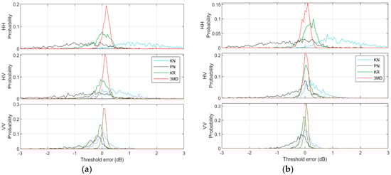 As with the INGARA results, there are no clear trends with the goodness of fit metrics as a function of wind direction. The next results consider the dual-frequency SAR data collected at 45° grazing and over the full 360° azimuth range (Run 8). For both the L and X-band datasets, histograms of the BD and threshold errors are shown in Figure 20 and Figure 21 at a CCDF value of 10−4. For the L-band data, the BD is low (≤−30 dB) for the four investigated models suggesting that they all match closely to the body of distribution, regardless of the polarization state. For the X-band data, the mean BD values increase for each model with the KN distribution showing the largest increase. There is also an increase in the spread of BD values at X-band. For the threshold error results, the 3MD distribution clearly has the lowest error at both frequencies with no bias around 0 dB. We find that the KN model has under fitted both data sets, while the PN and KR histograms show an over fitting. For the KN, PN, and KR models, the threshold error increases at X-band, probably due to data being spikier.