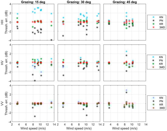 For the threshold error in Figure 16, the 3MD distribution clearly has the lowest error with very little bias around 0 dB. The KR distribution also has a low error spread, while the KN and PN show a wide range of threshold errors. Figure 17 then shows the threshold errors over the 12 different days/wind speeds in the upwind direction for grazing angles of 15°, 30°, and 45°. The same spread of errors are observed here with a large mismatch for the KN and PN distributions with mean absolute values of 0.76 and 0.89 dB respectively, while the KR and 3MD models show the lowest absolute mean errors of 0.30 and 0.11 dB. The largest errors were observed within the HH polarization at the lowest grazing angles for the PN and KN models, while data from the VV polarization showed a significantly reduced threshold error across all grazing angles.