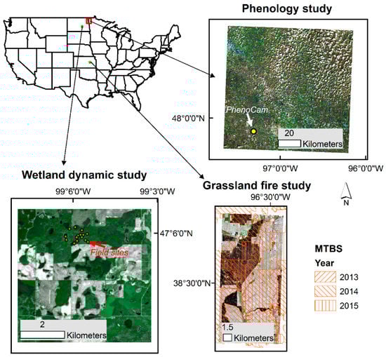 Location of the three study areas. The background images for phenology, grassland fire, and wetland dynamics are true-color composites from Landsat-8 on 27 July, 8 April, and 20 June 2016, respectively.The dashed lines in the grassland fire study area are burned areas from 2013 to 2015, as indicated by the Monitoring Trends in Burn Severity (MTBS) product.