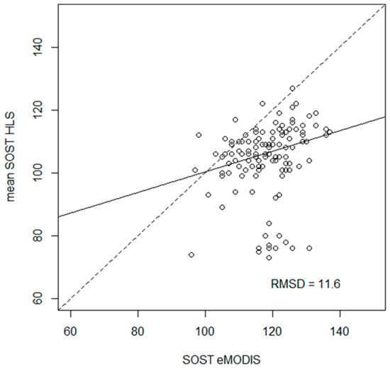 Relationship between eMODIS grassland SOST and mean SOST from corresponding cells in HLS data. RMSD represents the root mean squared difference [36]. The solid line shows the robust linear regression result (RMSD = 11.6). The dashed line is 1:1 line.