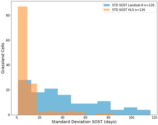 The distribution of SOST standard deviation (STD) for grassland pixels calculated from time series Landsat-8 and HLS.