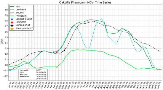 NDVI trajectories and calculated SOST from time series of Landsat-8, HLS, eMODIS, and PhenoCam data for the Oakville PhenoCam location.