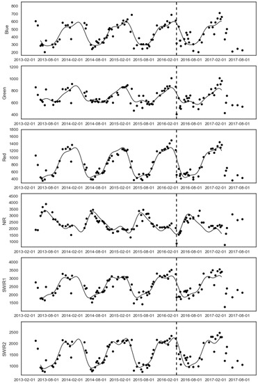 Time series of HLS clear observations (black dots) and CCDC model (solid line). The vertical dashed line shows the fire event (8 April 2016) indicated by the BAECV product. Spectral range of displayed bands are Blue (0.45–0.51 µm); Green (0.53–0.59 µm); Red (0.64–0.67 µm); NIR (0.85–0.88 µm); SWIR1 (1.57–1.65 µm); SWIR2 (2.11–2.29 µm).