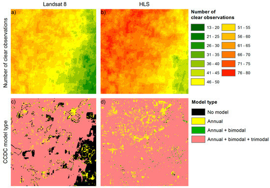 The top row indicates all available clear observations for the (a) Landsat-8 and (b) HLS time series for 2016. The bottom row shows the harmonic frequencies selected by CCDC 2016 models for both (c) Landsat-8 and (d) the HLS data.