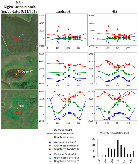 To illustrate how seasonal variation differs for wetland types, time series for three example pixels are shown: a permanent lake (referred to as P4); an open basin, flow-through wetland (referred to as T3); and a recharge wetland (referred to as T8). According to water surface elevation data, P4 contained water throughout the entire year and had water depths ranging from 1.67 m to 1.89 m [30]. T3 was inundated most of the year, but water depths were usually less than 0.42 m. T8 had water for only two weeks, during late April and early May of 2016, and had the shallowest water depths (≤0.13 m) [30]. In Figure 11, orthophotography of the three wetland types indicated spectral response differences between the wetland types. The TC seasonal variation from models based on HLS or Landsat-8 also reflected these differences. With Landsat-8 data, CCDC built models for annual and intra-annual bimodal and trimodal (full model) frequencies for P4 and T8, but no models were generated for T3. Using the HLS data, CCDC built full models in P4, T3 and T8. Models built from HLS data also appear to reflect more of the expected seasonal dynamics in T3 and T8 when compared with seasonal precipitation [23,39] than the models based on Landsat-8 only data (Figure 11). The wetland P4 contained water throughout the season, and the TC indices indicated less seasonal variation as the TC-wetness values remained higher than those in the more dynamic systems that had less inundation. The three observations in Figure 11 with remarkably high TC-brightness were due to thin cloud contamination that was missed by the HLS cloud mask. Both T3 and T8 show pronounced seasonal variation in TC indices, and T8 had slightly higher TC-greenness than T3, reflecting less inundation and more visible growth of aquatic vegetation (Figure 11).