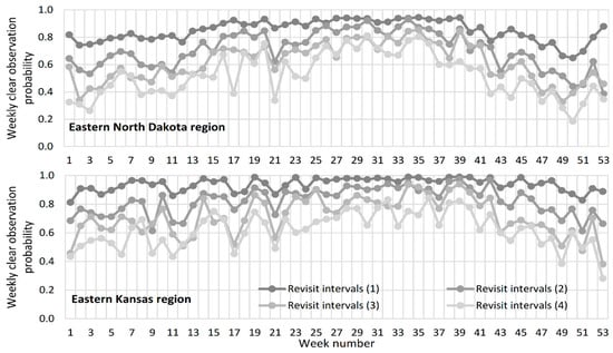 A common finding in all three grassland applications was that the combination of frequency and timing of observations was critical to successfully identify key processes at a 30-m resolution. We considered the plausibility of meeting this data need by using information from the quality bands from all available 500-m MODIS Surface Reflectance Daily data (MOD09GA) [44] to estimate the probability of cloud cover in eastern North Dakota and eastern Kansas. Figure 12 shows the probability associated with different revisit intervals for acquiring at least one clear observation per week, which is needed to generate weekly composites with eMODIS data. From this, we estimated that a 3-day revisit interval would provide adequate time series data to study grassland dynamics, particularly during the early part of the growing season (weeks 14–17 in our study areas). This data frequency would lead to a greater than 50% probability of providing a weekly clear observation. Cloudier areas would require a shorter revisit period to maintain or increase the probability of a clear observation. In the future, with the combination of Landsat-8, Sentinel-2A, and Sentinel-2B, and the planned launch of Landsat-9, the global median average revisit interval could reach less than 3 days [15,45]. This speaks to the importance of maintaining the continuity of future Landsat missions and interoperability between Landsat and Sentinel-2 missions to support local to regional monitoring of landscape dynamics for informing decisions on land resources.