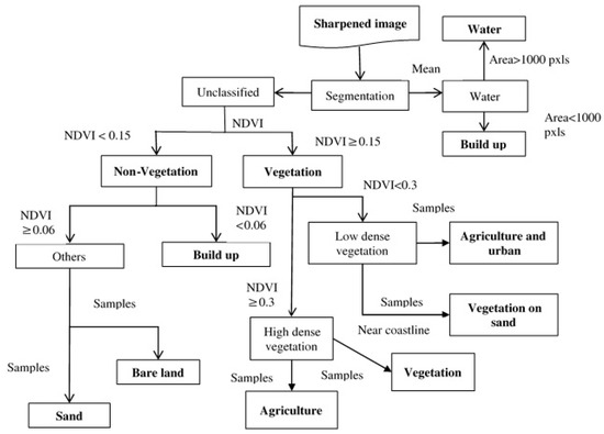 - Shadowed areas: On GeoEye 1 image, we observed shadows of vegetation and low buildings. In this circumstance, this shadow effect was not significant, so no further procedure was applied. However, if shadow effects are obvious (mainly in urban or forested areas), an object—spatial relationship (nearest neighbor, for instance) will be applied in the decision rules.